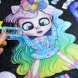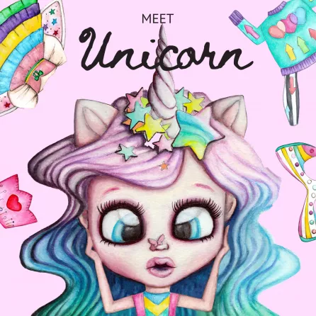 Unique illustrations in watercolours, pencils, and inks, inspired by a unicorn character