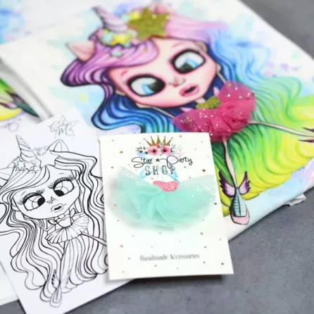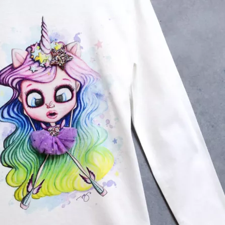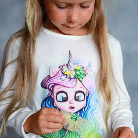 Inspired by a unicorn hand-drawn in doll style.Interactive and playful, with a changeable dress and a star on hoop and loop tape.Handmade and sewed in Latvia with high quality softest material: 96% organic cotton and 4% elastane.Available for girls aged 2-12 with short and long sleeves.