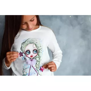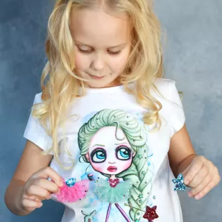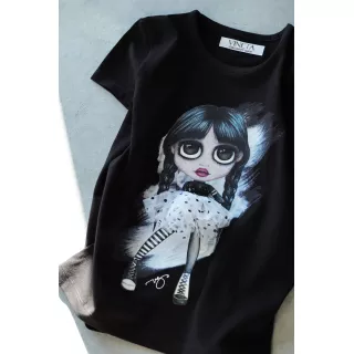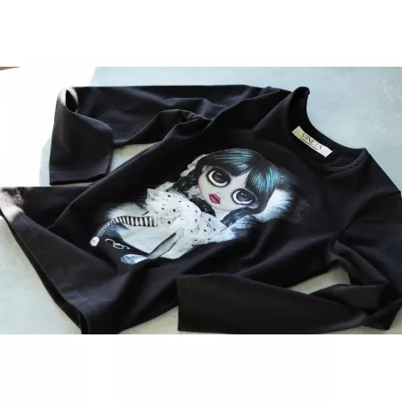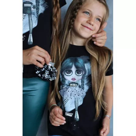 Inspired by the character Wednesday Addams. Interactive and playful, with a changeable dress and a star on hoop and loop tape.Handmade and sewed in Latvia with high quality softest material: 96% organic cotton and 4% elastane. Available for girls aged 2-12 in black and white with short and long sleeves.