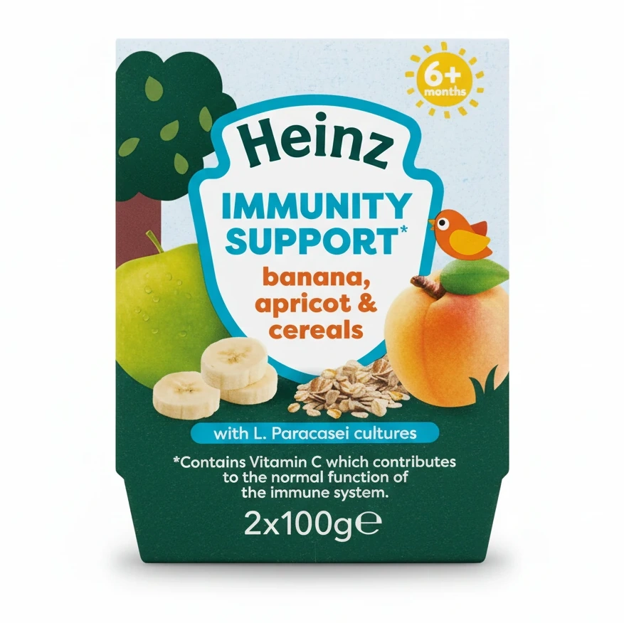 Made with L. Paracasei cultures and a good source of Vitamin C, it helps support the immune system naturally. The ingredients include apple, banana, apricot, cornflour, and cereals like oat, wheat, and rice, enhanced with fermented milk powder.
