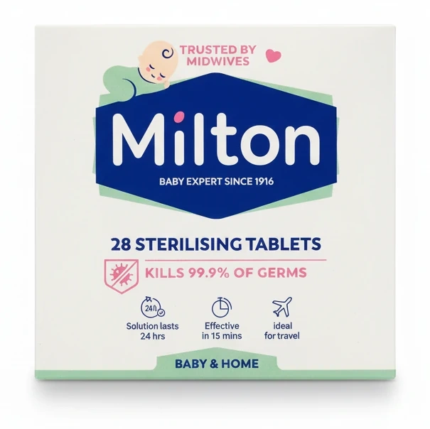Milton Sterilising Tablets provide a reliable and easy way to keep baby accessories and household items hygienically clean. Trusted by midwives, these tablets kill 99.9% of germs without the need for heating or electricity, making them a convenient choice for busy parents and travellers alike.