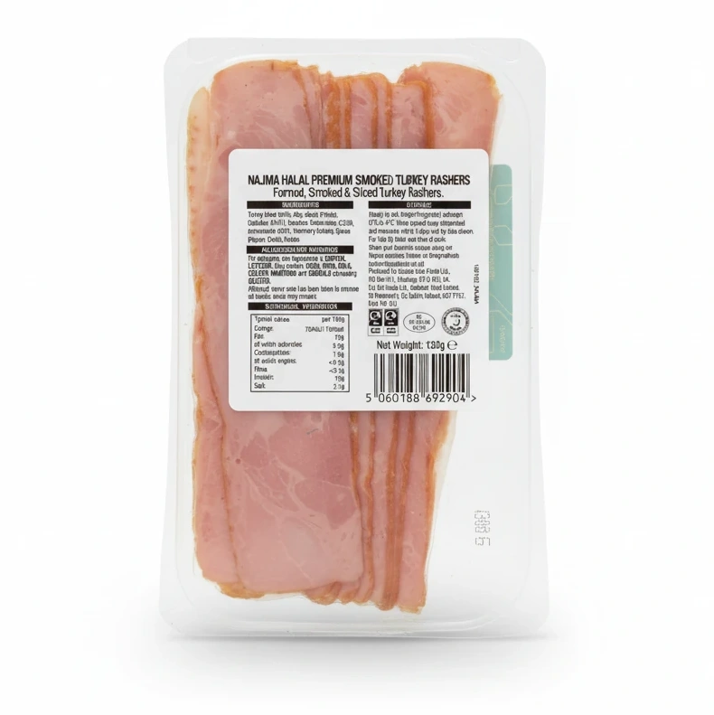 Enjoy the rich, smoky flavour of Najma's premium smoked beechwood turkey rashers. These ready-to-eat slices offer a delicious source of protein, perfect for quick meals or tasty sandwiches.