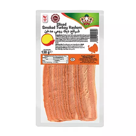 Enjoy the deliciously rich and smoky flavour of Zaad Sliced Smoked Turkey Rashers, expertly prepared from 100% halal-certified turkey meat to bring you quality and taste you can trust.