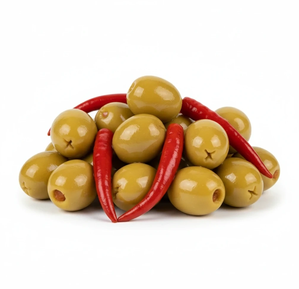 Enjoy a vibrant and zesty snack with these spicy green olives, perfectly paired with fiery red chili peppers. This combination delivers a delightful balance of briny olive flavour and a bold, spicy kick that makes it a fantastic addition to any charcuterie board or a sophisticated snack on its own.