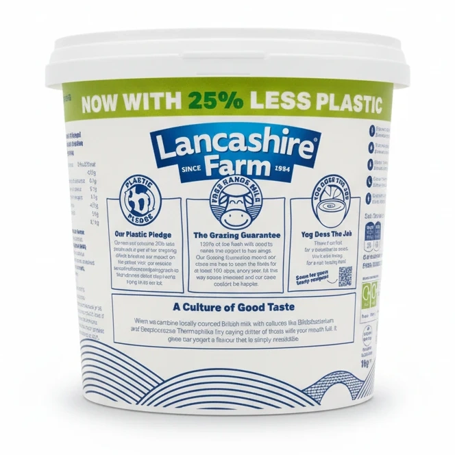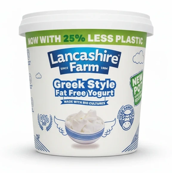 Committed to environmental care, the packaging features 25% less plastic, reflecting Lancashire Farm's dedication to sustainability and reducing plastic waste. It comes in a convenient 1kg pot, ideal for families or regular yogurt lovers.