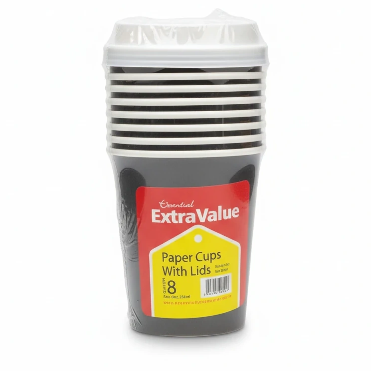 These Essential ExtraValue Paper Cups with Lids offer a convenient solution for your hot drink needs. Made to hold 8oz (234ml), they are ideal for coffee, tea, or any warm beverage on the go. The set includes 8 cups, each accompanied by a secure white lid to prevent spills, making them perfect for travel or office use.
