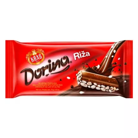 Dorina Riza Milk Chocolate with Puffed Rice - 75 g.Puffy crunchiness awaits you with every bite of this milk chocolate bar!Ingredients: sugar cocoa butter skimmed milk powder puffed rice 11% cocoa mass whey powder (milk) milk fat emulsifier soya lecithin artificial vanilla flavor. Cocoa solids: 29% minimum milk chocolate. Milk chocolate contains min. 20% dry milk solids. May contain hazelnuts and gluten.HalalProduct of Croatia