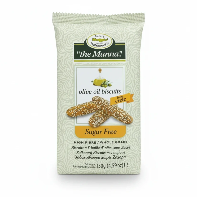 These delightful olive oil biscuits from Crete bring a unique taste of traditional Greek baking to your table. Made with whole grain and enriched with high fibre, they offer a wholesome snack option without any added sugar. Their light texture and natural ingredients make them perfect for enjoying with tea or coffee, or as a healthy treat anytime.
