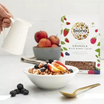 - Sumptuous and filling, our Biona Organic Granola with Wild Berries is just the thing to get you out of bed. The goodness of rolled wholegrain oats are combined with a variety of tangy organic berries and baked into crispy clusters.