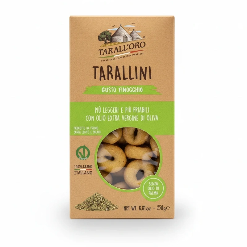 Enjoy the authentic taste of traditional Italian Tarallini with a delightful fennel flavour. These light and crumbly snacks are crafted using 100% Italian wheat, baked to perfection without yeast or sulphites, providing a wholesome treat.