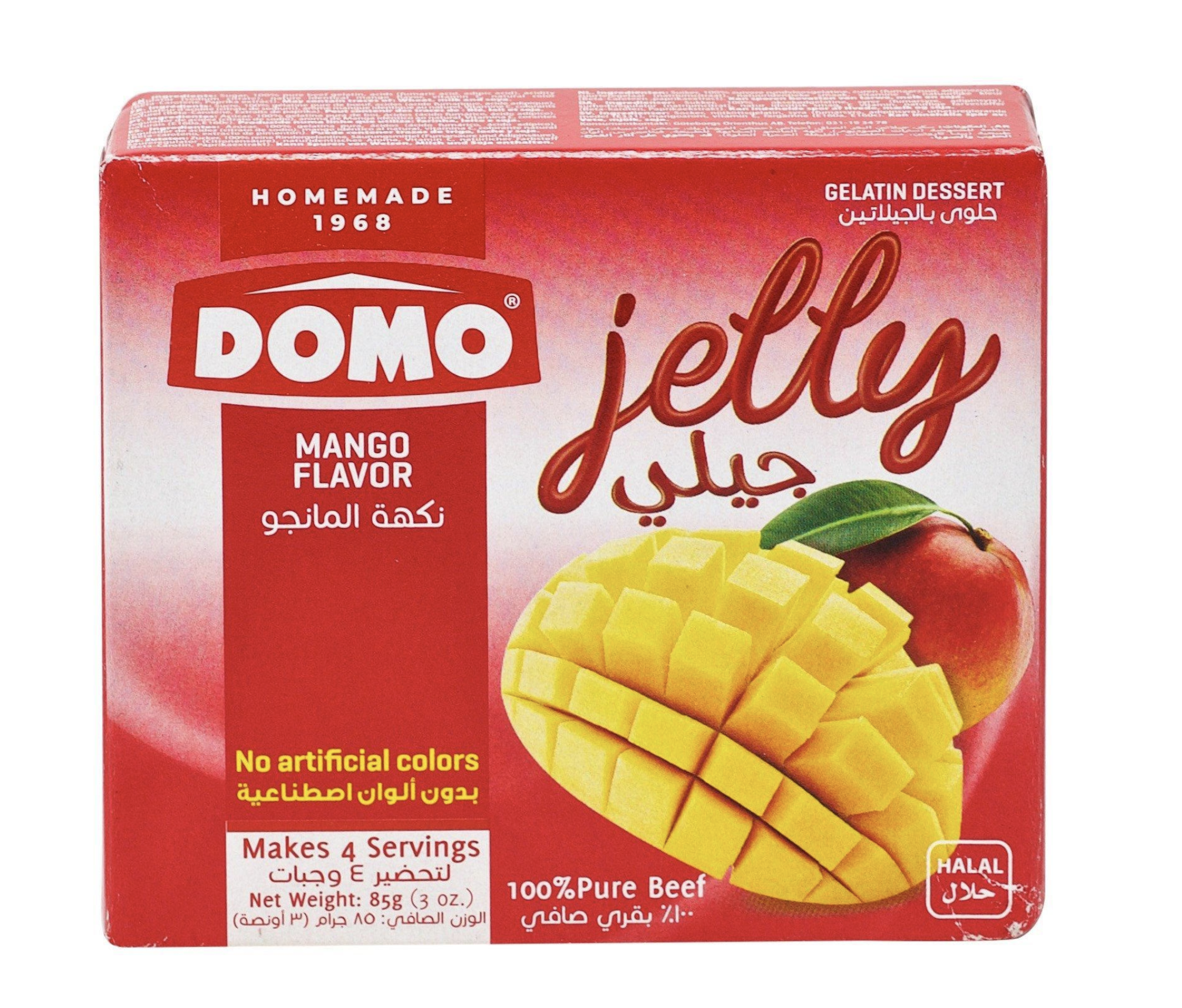 The ingredients include sugar, 100% pure beef gelatin, acids (fumaric acid, adipic acid), an acidity regulator (sodium citrate), natural identical Mango flavour, vitamin C, and natural colours (beta-carotene, beetroot red).