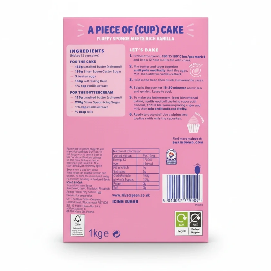 Enjoy easy-to-follow baking guidance on the pack, helping you create delicious vanilla cupcakes topped with a fluffy sponge and rich buttercream. The product supports British farmers and sustainability, reflecting responsible sourcing.