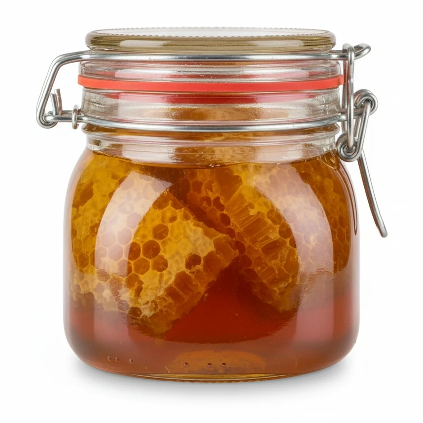 This delightful Hasbal syrup with comb honey brings a natural sweetness and rich texture to your kitchen. Beautifully presented in a glass jar with a secure clamp lid, it contains luscious honey along with pieces of authentic honeycomb.