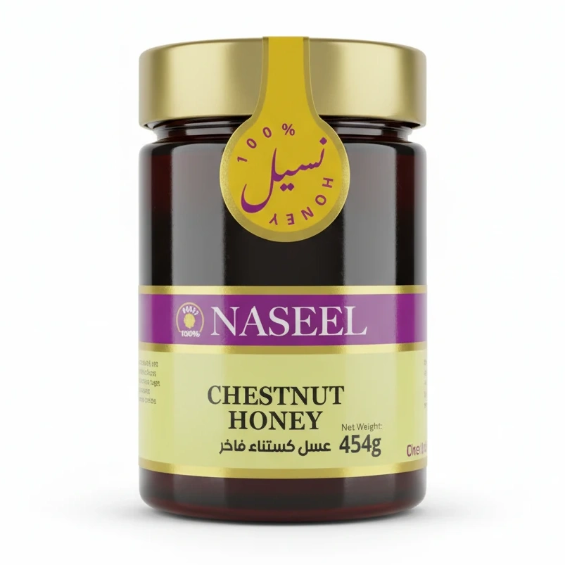 Enjoy the rich and distinctive flavour of Naseel Chestnut Honey, a premium quality honey sourced directly from Spain. Known for its dark, amber colour and unique taste, chestnut honey offers a slightly bitter, yet smooth and earthy flavour that stands out from regular honey varieties.