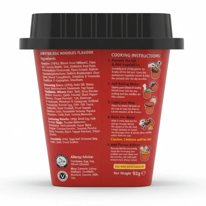 Noodles (Wheat Flour, Palm Oil, Tapioca Starch, Salt, Glutinous Rice Flour, MSG, Yeast Extract, Sodium Hexametaphosphate, Sodium Bicarbonate, Guar Gum, Mixed Tocopherols, Disodium 5'-Inosinate, Disodium 5'-Guanylate, Riboflavin), Seasoning Sauce (Palm Oil, Water, Sugar, MSG, Soy Sauce (Soybean, Wheat Flour, Salt), Spice Powders, Artificial Flavourings including Salted Egg, Crab, Fish Sauce, Coriander, Fried Shallot), Dried Egg Yolk Powder, Vegetable Soya Ball, Dried Scallion