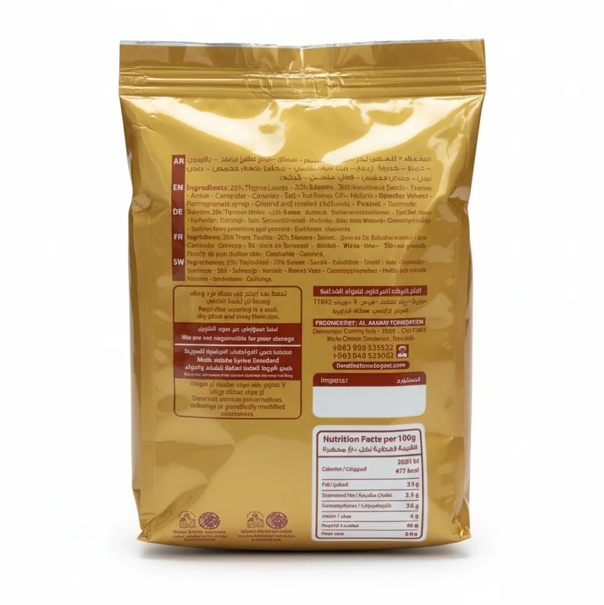 25% Thyme Leaves, 25% Sesame Seeds, Sumac, Roasted Wheat, Fennel, Anise, Coriander, Caraway, Salt, Sunflower Oil, Mahlab, Pomegranate Syrup, Ground and Roasted Chickpeas, Peanut, Turmeric
