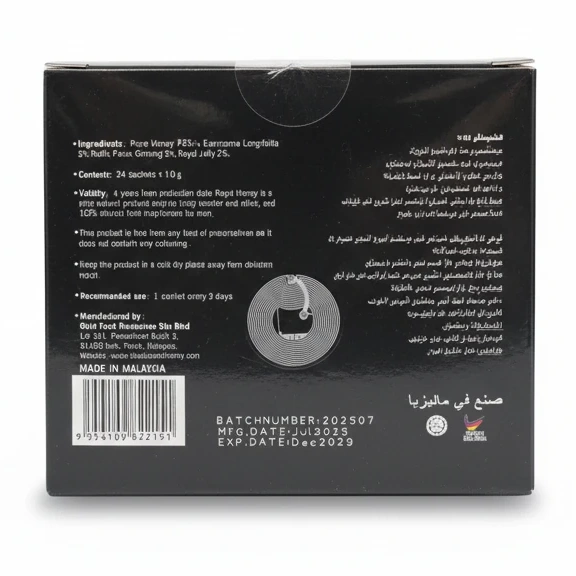 Each box contains 24 sachets of 10g, offering convenient sachets for easy consumption every three days. Extracted with care, this blend combines the wholesome goodness of pure honey (93%) with the enriching benefits of Radix Eurycoma Longifolia (3%), Panax Ginseng (2%), and Royal Jelly (2%).
