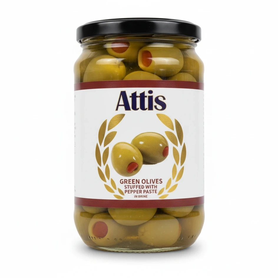 Enjoy the tangy zest of Attis Green Olives, perfectly stuffed with a vibrant pepper paste. These olives come packed in brine to preserve their freshness and distinctive flavour.
