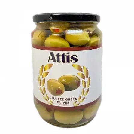 4. Close-up of spicy green olives mixed with red chilipeppers lose outside container