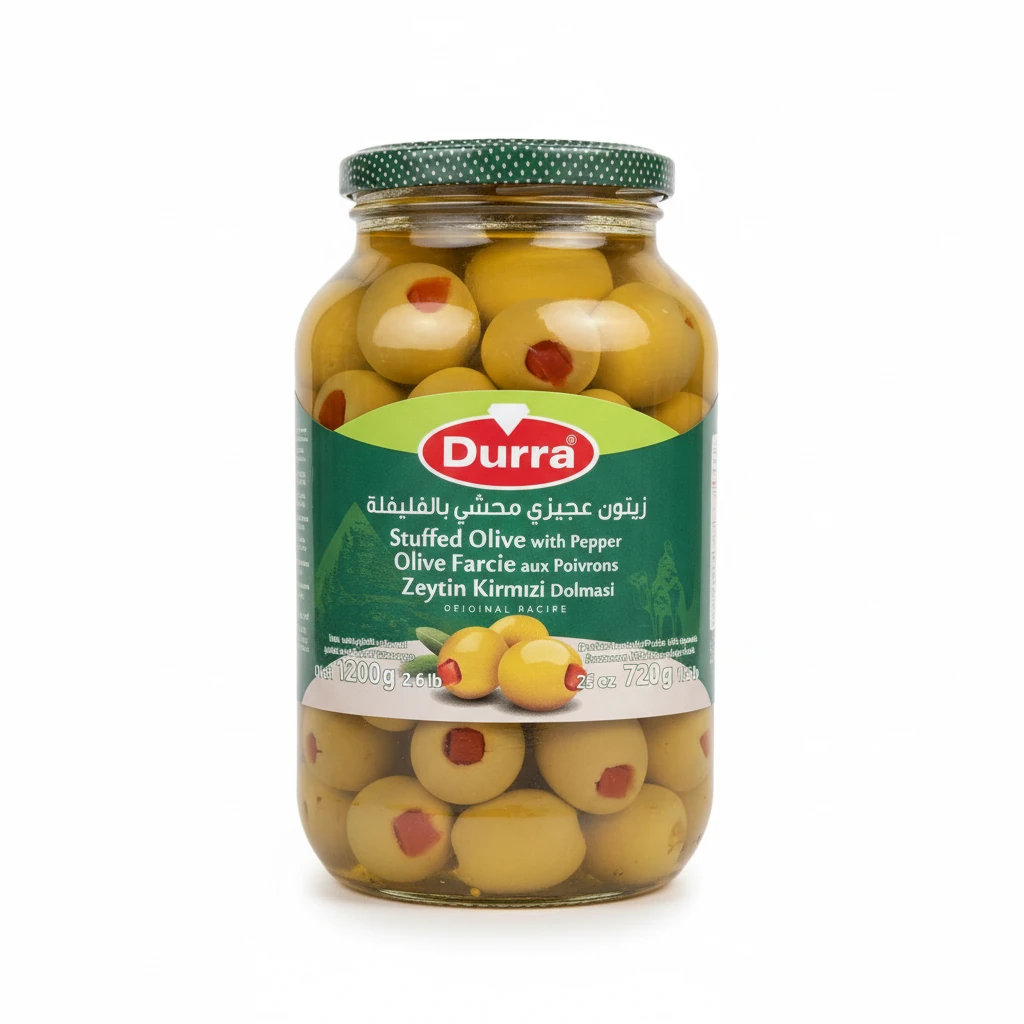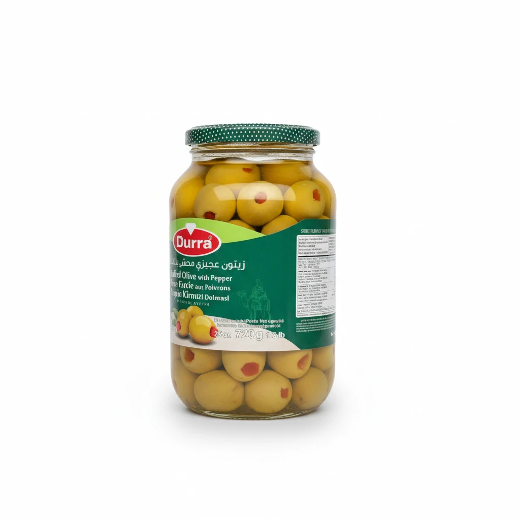 Enjoy the authentic taste of Durra's Stuffed Olive with Pepper, a delicious addition to any meal or snack. These green olives are carefully stuffed with vibrant red pepper, offering a mild spice and a burst of flavour in every bite.