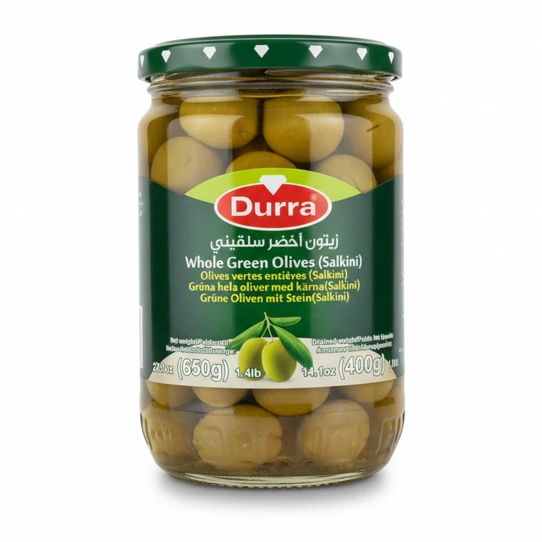 Enjoy the authentic taste of Durra Whole Green Olives (Salkini), carefully packed to bring freshness and flavour to your table. These olives are perfect for snacking, adding to your salads, or enhancing your cooking with their rich and slightly tangy taste.