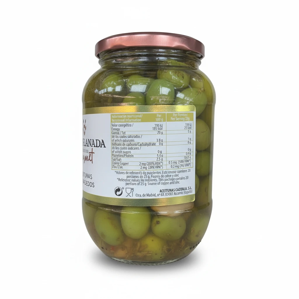 Enjoy the authentic taste of Spain with these La Explanada Gourmet Cracked Green Olives, carefully marinated to capture bold Mediterranean flavours. Each olive is perfectly cracked to allow the rich blend of garlic, red pepper, and olive oil to infuse, giving every bite a delightful and vibrant character.