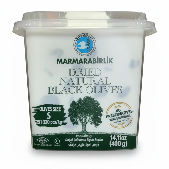 These Marmarabirlik dried natural black olives bring a rich, authentic taste straight from Turkey to your table. Carefully dried and naturally preserved without any artificial preservatives, these olives maintain their deep, intense flavour and firm texture.