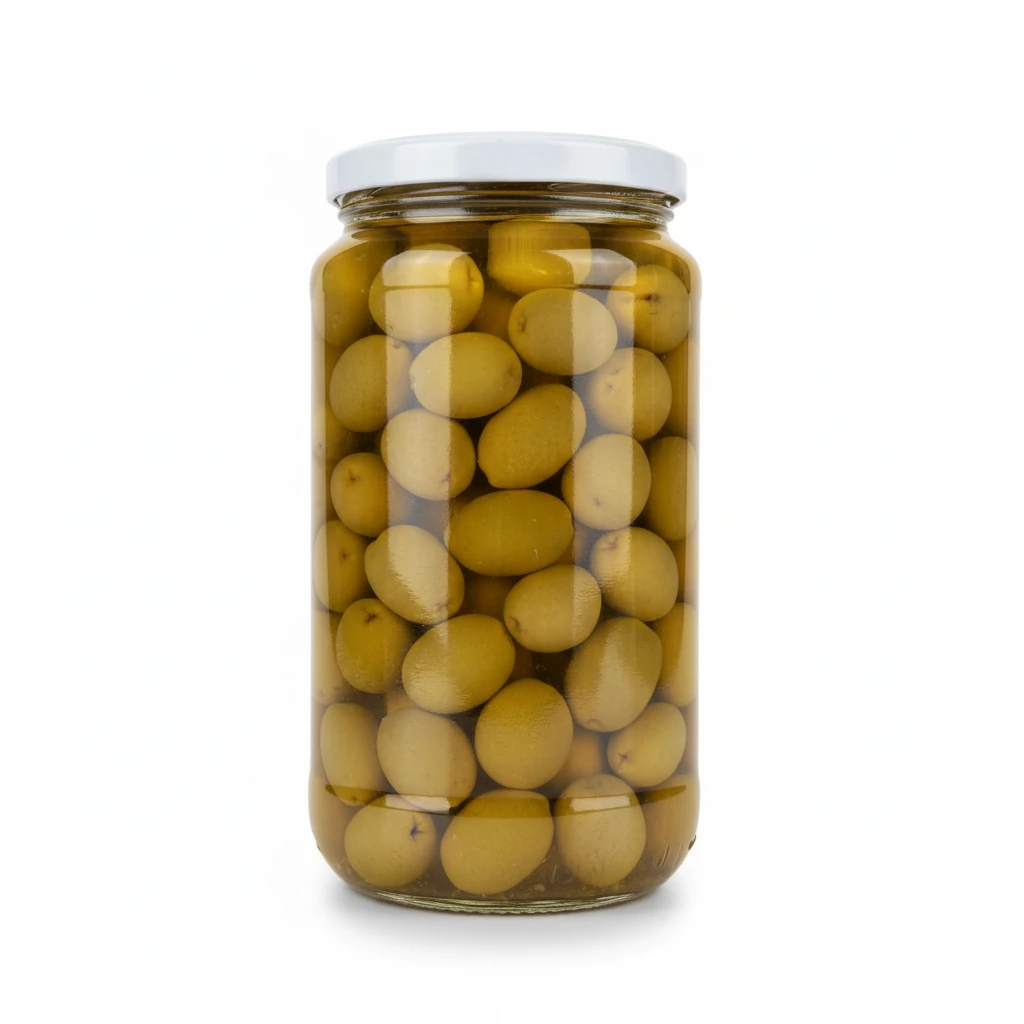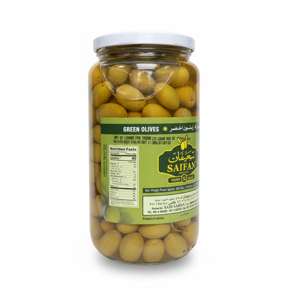 - Premium Lebanese green olives in natural brine