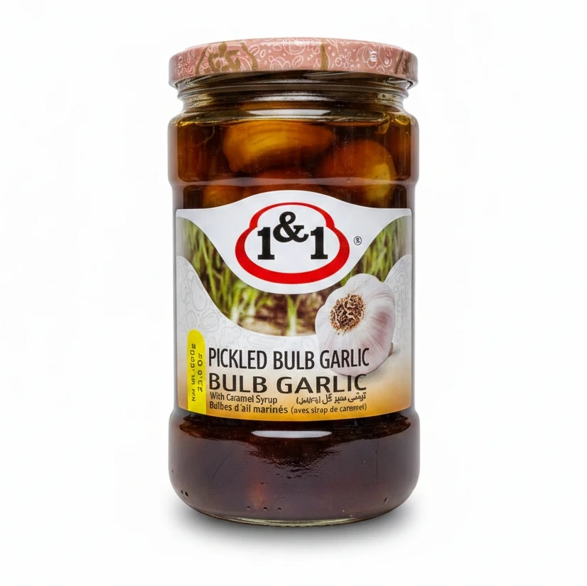 Enjoy the unique taste of 1&1 Pickled Bulb Garlic, expertly preserved in a rich caramel syrup. This delightful combination offers a sweet and tangy flavour that brings an exciting twist to traditional garlic. Perfect for enhancing salads, grilled dishes, or charcuterie boards.