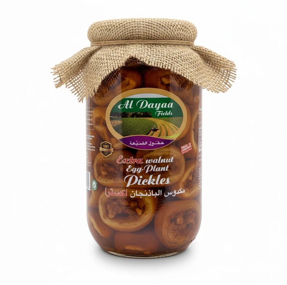Enjoy the distinctive taste of Al Dayaa Fields Extra Walnut Eggplant Pickles, a traditional Lebanese delicacy that brings a burst of flavour to any meal. This jar is filled with soft, tangy eggplant pieces combined with crunchy walnuts, preserved in a rich, balanced marinade.