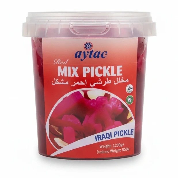 Add a vibrant and tangy twist to your meals with Aytac's Red Mix Pickle, a traditional Iraqi pickle made from a variety of fresh vegetables and bold spices.