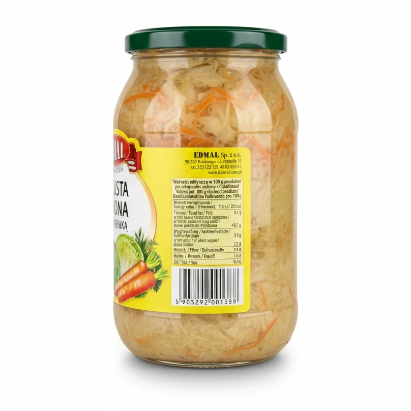 Enjoy the authentic taste of traditional Polish sauerkraut combined with the natural sweetness of fresh carrots. This jar of Edmal's sauerkraut offers a tangy and crunchy side dish that's perfect for meals throughout the day.