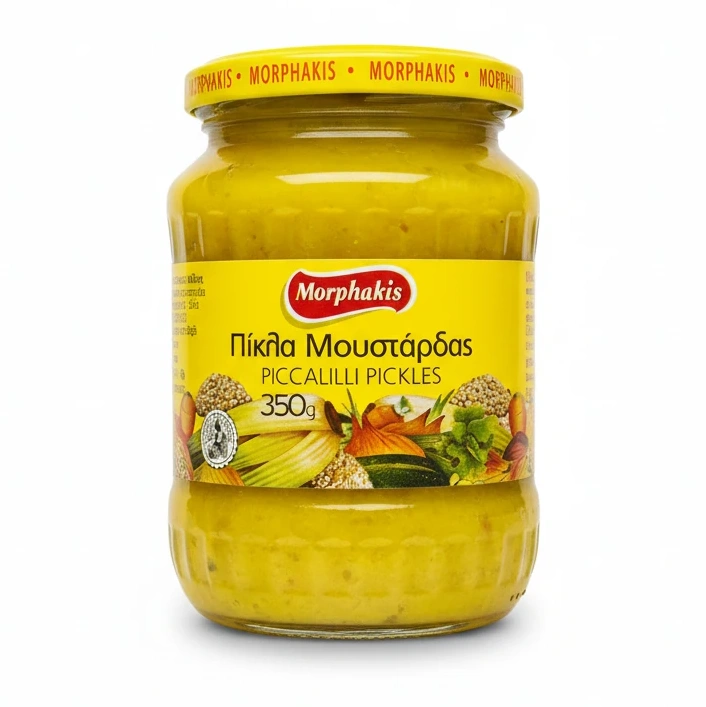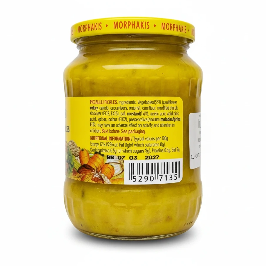 Add a tangy, mustard-spiced kick to your meals with Morphakis Piccalilli Pickles. This vibrant yellow condiment, packed in a convenient 350g jar, combines a medley of crisp vegetables including cauliflower, celery, carrots, cucumbers, and onions. The distinct mustard flavour is perfectly balanced with gentle spices and a hint of acidity for a delicious, versatile pickle.