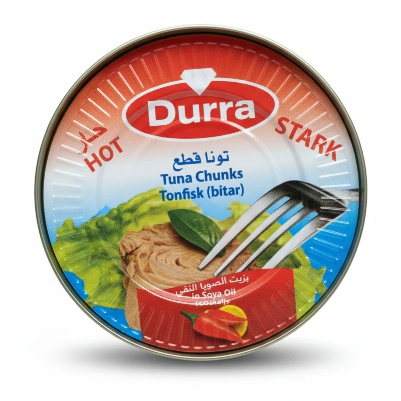Enjoy the bold flavours of Durra Tuna Chunks, packed in soya oil with a spicy kick. This convenient can holds tender tuna chunks perfectly blended with a hot chilli flavour, ideal for those who love a bit of heat in their meals.
