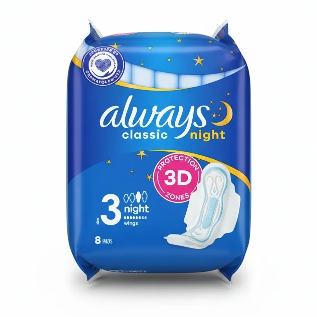 These Always Classic Night Sanitary Pads offer reliable protection designed specifically for overnight use. With 3D protection zones to guard against leaks, they help you feel secure and comfortable all night long. Featuring wings for extra stay-put convenience, these pads are ideal for heavier flow during nighttime.