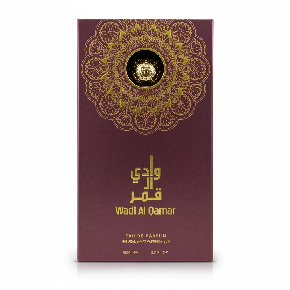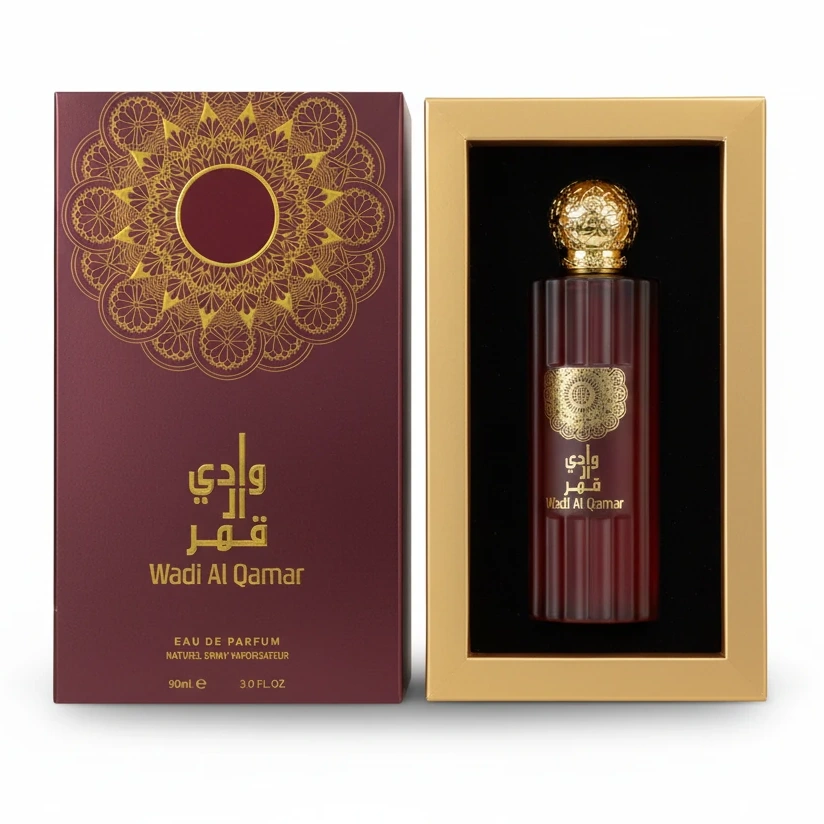 Experience the enchanting allure of Wadi Al Qamar Eau de Parfum, a beautifully crafted fragrance presented in a 90ml elegant bottle. The perfume embodies sophistication with its rich, dark red fluted glass container capped by an ornately designed golden lid, symbolising luxury and attention to detail.