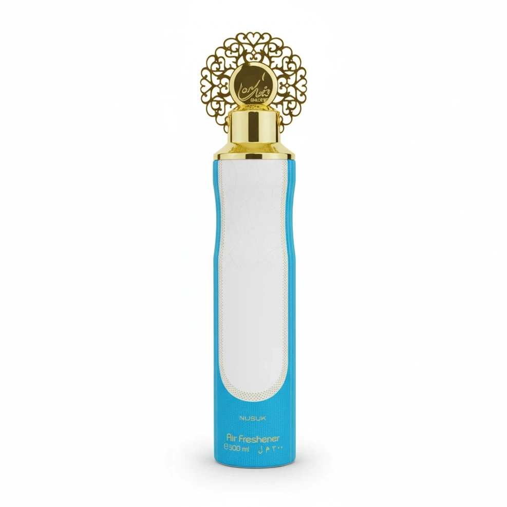 Bring a refreshing and captivating scent to your home or workspace with Ahbami Nusuk Air Freshener. Packaged in a beautifully designed blue bottle with a unique gold ornamental cap, this air freshener fits seamlessly into any décor while delivering a burst of long-lasting fragrance.