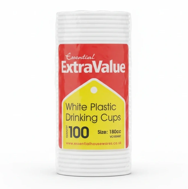These Extra Value white plastic drinking cups come in a convenient pack of 100, each with a capacity of 180cc. Ideal for parties, picnics, or busy households, these lightweight cups make serving drinks quick and easy without the fuss of washing up.