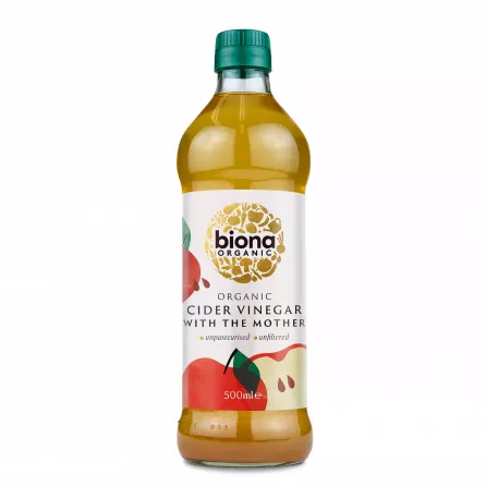 Made from pressed organic apple juice fermented with its vinegar Mother, our organic cider vinegar is aged for a robust finish. Its rich aroma and fruity, tangy taste are underpinned by a host of valuable enzymes, making this cider vinegar delicious and naturally healthy. Our raw, unfiltered vinegar is not heat-treated or pasteurised either, to keep enzymes happy. Use our cider vinegar in salad dressings and sauces for a moreish zing, condition your hair with it or even put it to use as a natural household cleaner. For an invigorating tonic, mix 1-2 tablespoons of Biona cider vinegar with honey in a glass of water and enjoy immediately. Our cider vinegar is pure and unfiltered, which can result in cloudiness or sediments: this does not affect its quality. 5% acidity