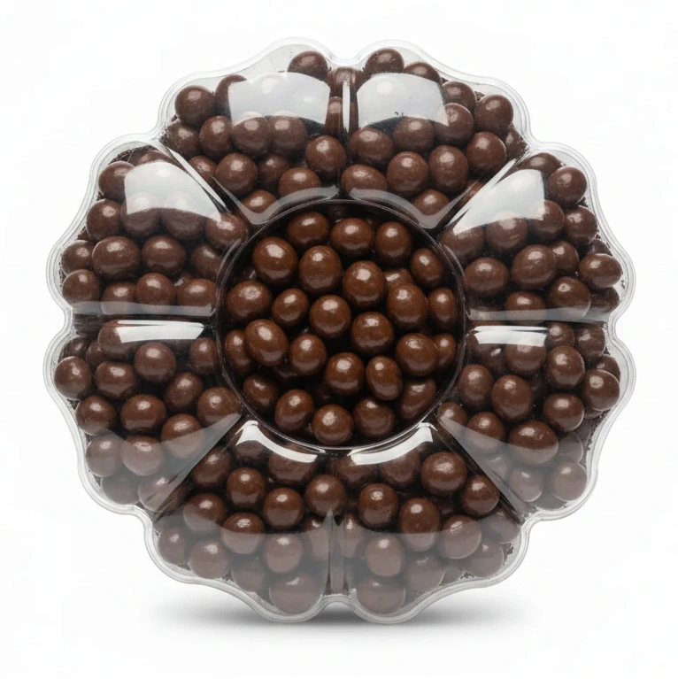 Presented in a unique flower-shaped transparent container, this chocolate nuts sampler offers a variety of chocolate-covered nut clusters, each crafted to provide a satisfying bite and texture contrast. It's an ideal snack for any time of the day or a charming addition to your dessert table.