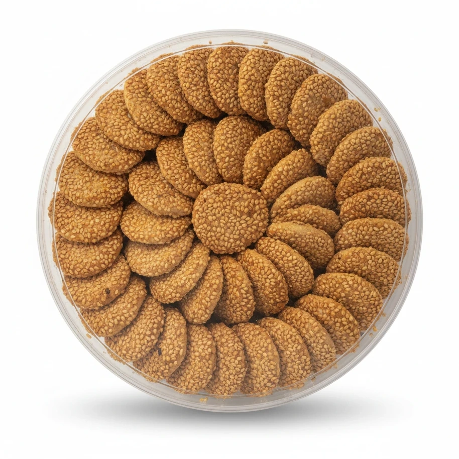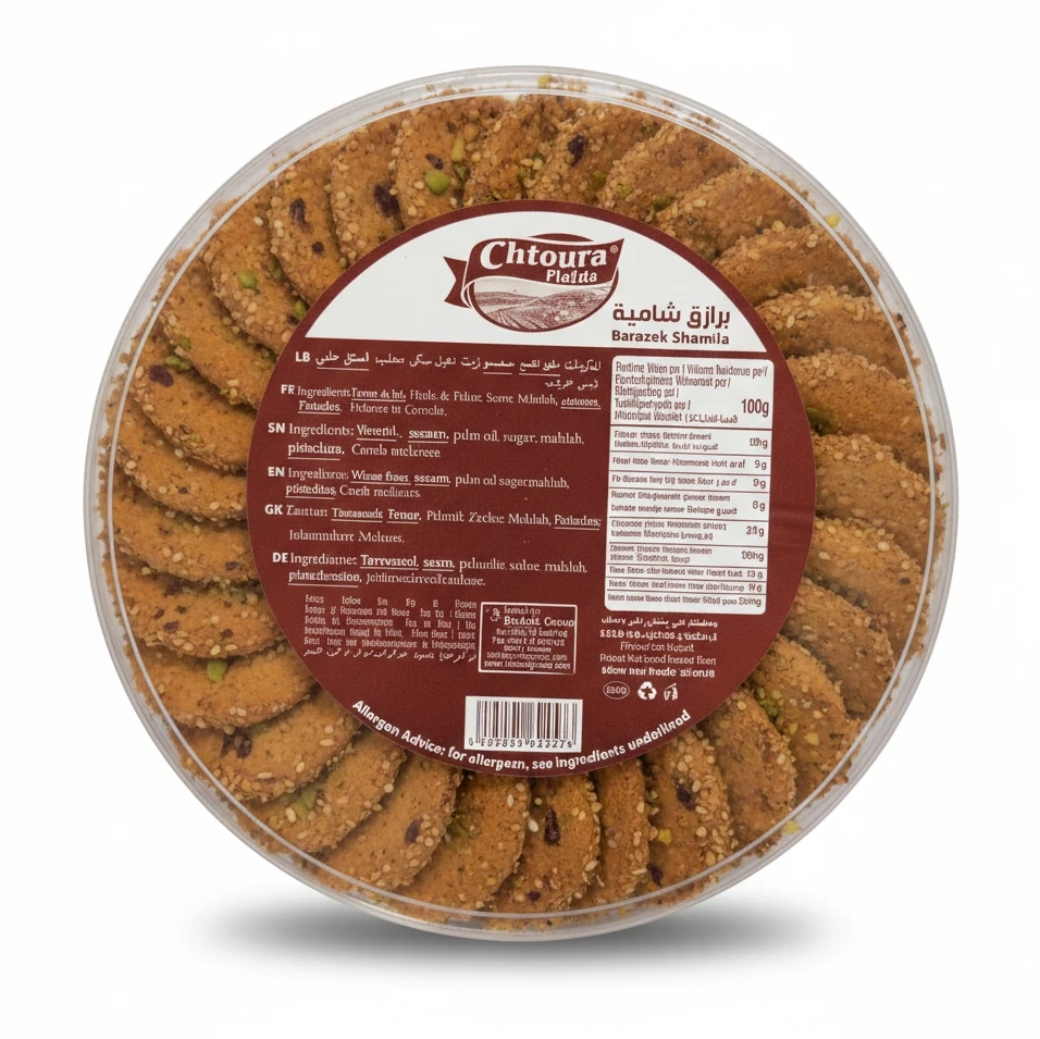 Barazek Shamiya from Chtoura Fields is a traditional sesame cookie that brings a delightful crunch with every bite. These cookies feature a generous coating of toasted sesame seeds, giving them a distinctive nutty flavour and texture that is perfect for tea time or as a tasty snack anytime.