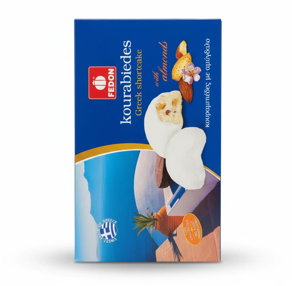 Enjoy the classic delight of Greek kourabiedes, lovingly crafted with a rich shortcake texture and studded with crunchy almonds.