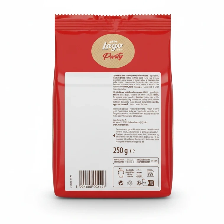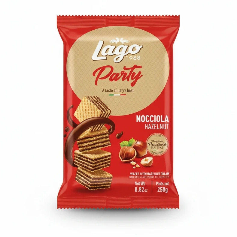 Enjoy the delicate crunch of Lago Party Wafers, layered generously with a smooth hazelnut cream. This Italian treat combines fine quality ingredients and authentic flavours, promising a little taste of Italy in every bite.