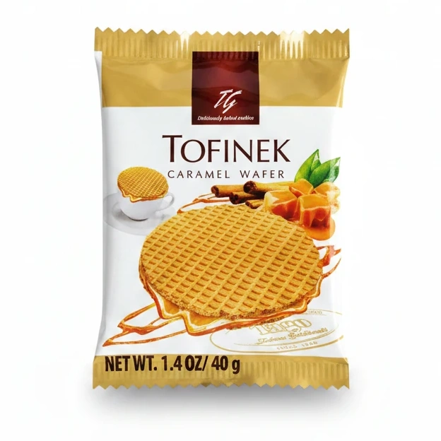Enjoy the delightful crispiness and rich caramel taste of Tofinek Caramel Wafer. This wafer combines a crunchy texture with a smooth caramel filling, offering a perfect balance of sweetness and flavour.