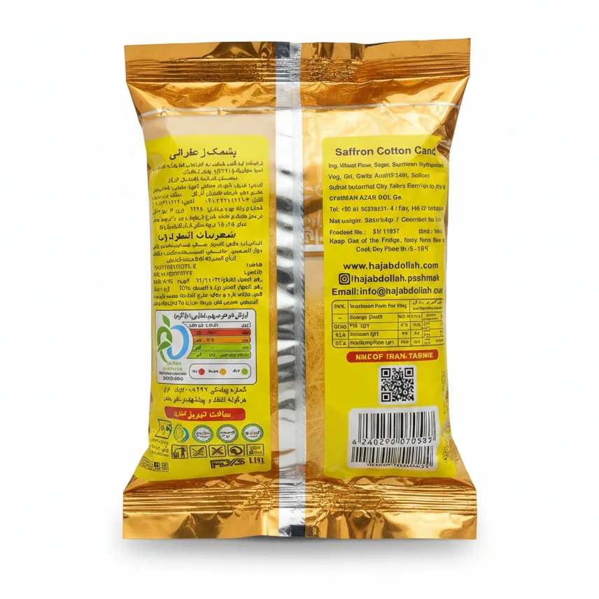 The bright golden strands testify to the genuine saffron infusion, making each bite flavorful and aromatic without overwhelming sweetness. Crafted with care, this cotton candy uses wheat flour, sugar, sunflower hydrogenated oil, vegetable oil, and saffron, combined to create a soft and pleasant treat.