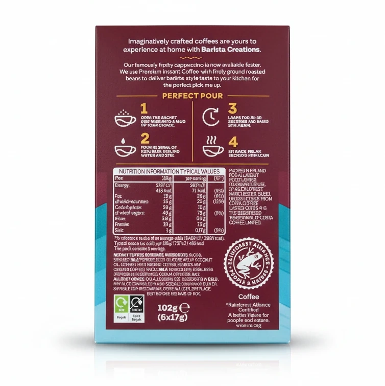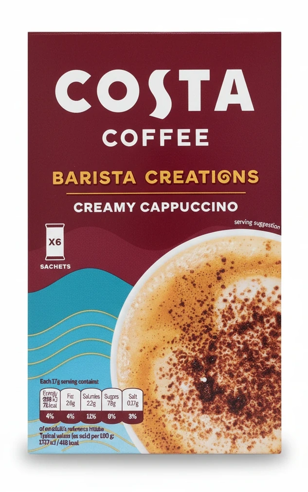Enjoy the rich, frothy delight of Costa Coffee's Barista Creations Creamy Cappuccino, crafted to give you a premium barista-style experience at home. Each sachet contains finely ground roasted beans blended with instant coffee, delivering an authentic taste that's smooth and creamy.