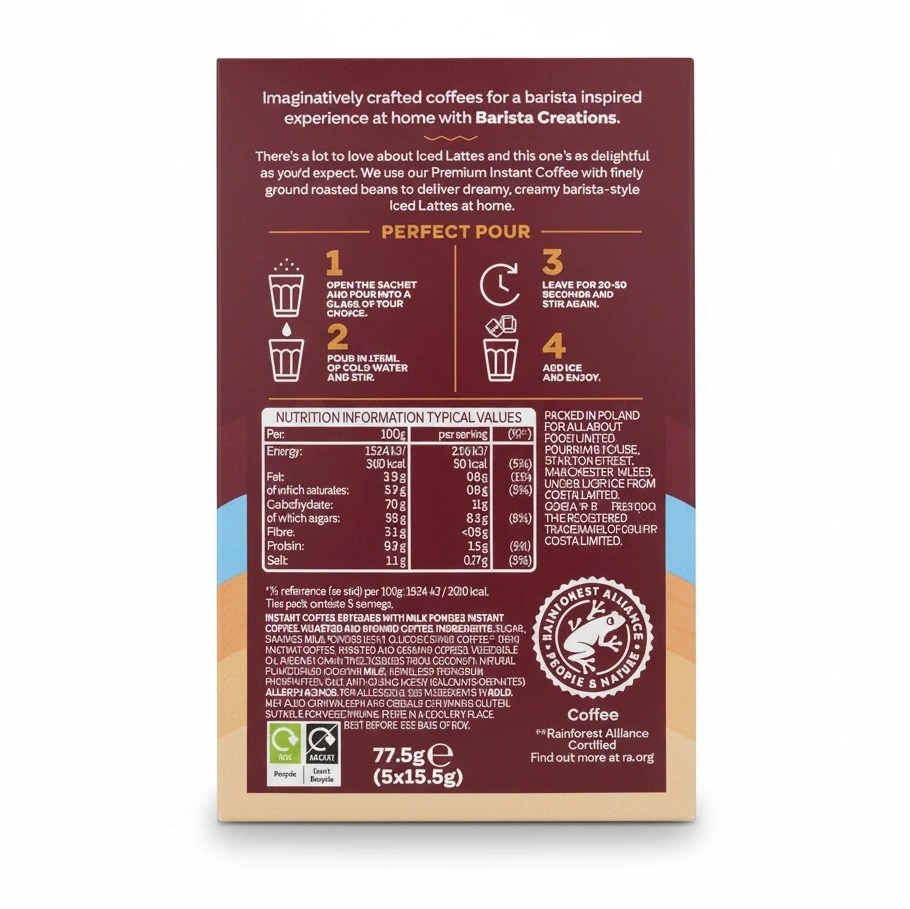 Each pack contains 5 conveniently portioned sachets, making it easy to prepare your favourite iced latte anytime. Simply dissolve a sachet in cold water, stir, and add ice for an ideal chilled coffee experience.