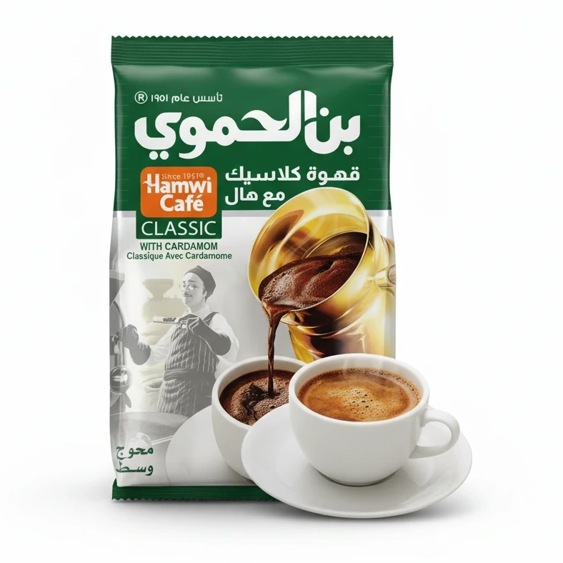 Enjoy the timeless taste of Hamwi Café Classic, perfectly blended with aromatic cardamom for a unique coffee experience. This medium roast coffee is finely ground for a smooth, rich flavour that combines the classic robustness with a subtle spice.