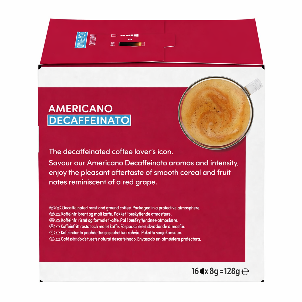 Nescafe Dolce Gusto Americano Decaffeinato offers a rich, aromatic coffee experience without the caffeine. Crafted for coffee lovers who prefer a smoother, decaffeinated option, this brew features nuanced flavours with a pleasant aftertaste reminiscent of smooth cereal and fruity red grape notes. The intensity level is rated at 4, providing a balanced and aromatic cup that satisfies without overwhelming.