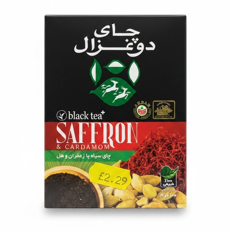 - Rich black tea base complemented by luxurious saffron and aromatic cardamom